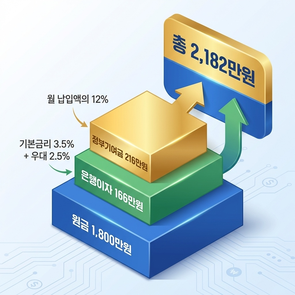 [납입 원금 1,800만 원] + [은행 이자 약 166만 원(세전)] + [정부 기여금 216만 원] = 총 수령액 약 2,182만 원